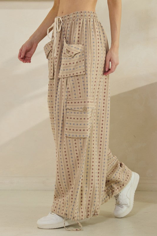 WASHED 3D POCKET FLOWER PATTERN WIDE LEG PANTS