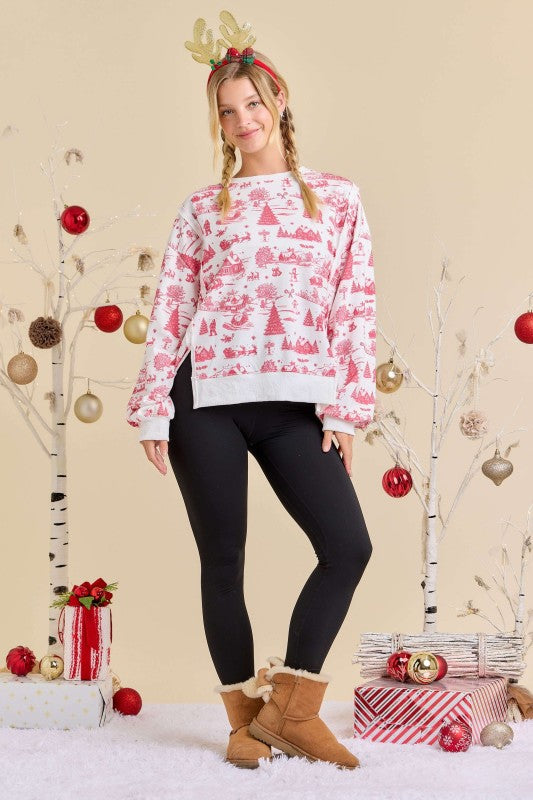 Christmas village sweatshirt, holiday print sweater, winter scene pullover, festive cabin sweatshirt, holiday jumper, green Christmas sweatshirt, cozy holiday sweater, scenic print pullover, winter wonderland top, Christmas outfit women, holiday party sweater, seasonal gift clothing, festive print sweatshirt, casual Christmas pullover