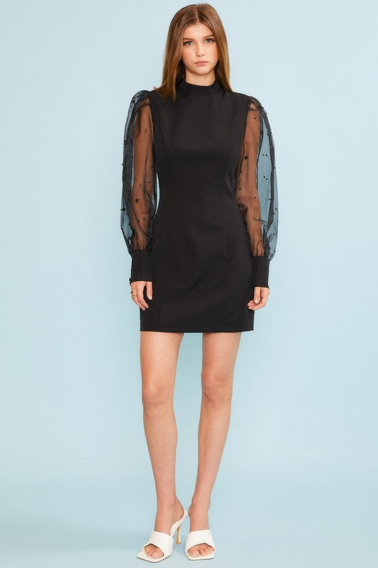 Mock Neck Puff Organza With Pearls Sleeve Back invisible zipper Solid Mini Dress90% POLY 10% SPAN BLACK