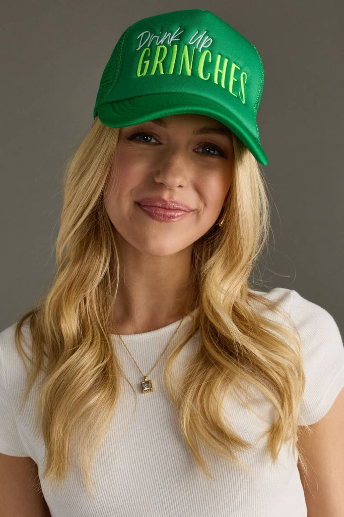 Green trucker hat White & green "Drink up Grinches" on front Adjustable snapback closure Breathable mesh 100% Polyester