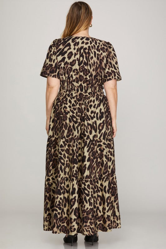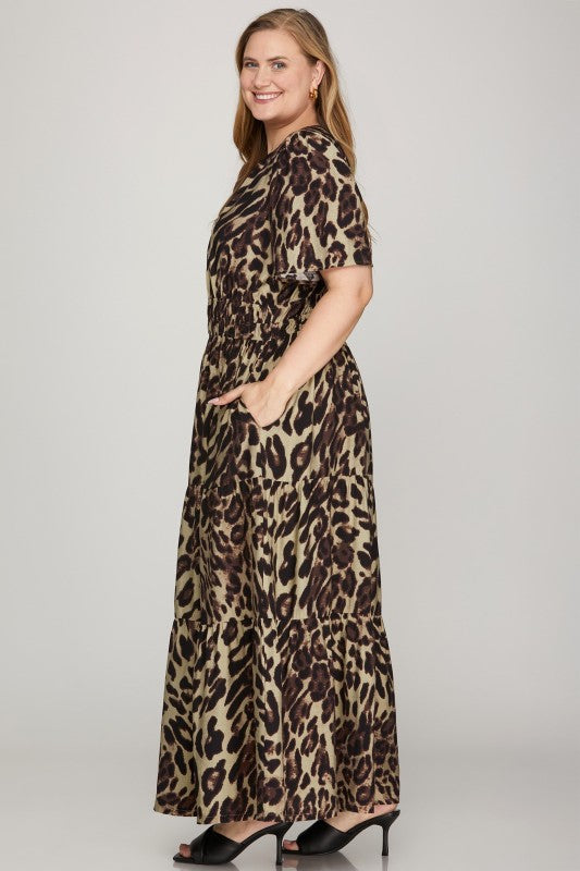 HALF SLEEVE LEOPARD PRINT WOVEN TIERED MAXI DRESS WITH ELASTIC WAIST BAND AND POCKETS