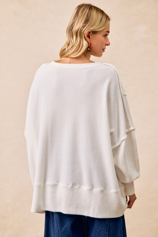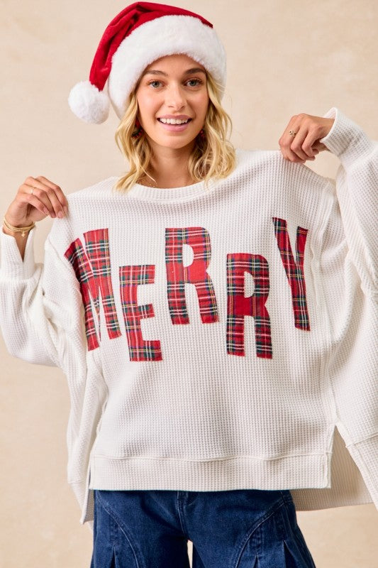 CHRISTMAS PLAID MERRY LETTERING CUT EDGE DETAIL OVERSIZED WAFFLE THERMAL SWEATSHIRT