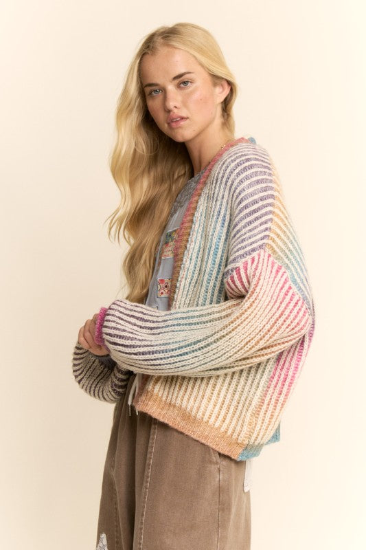 Elevate your boutique collection with this rainbow stripe open cardigan, blending vibrant hues with a lightweight knit for effortless layering. Featuring voluminous sleeves and a relaxed drape, it delivers both charm and versatility. A standout piece designed for refined casualwear, perfect for year-round styling that attracts customers seeking unique details.