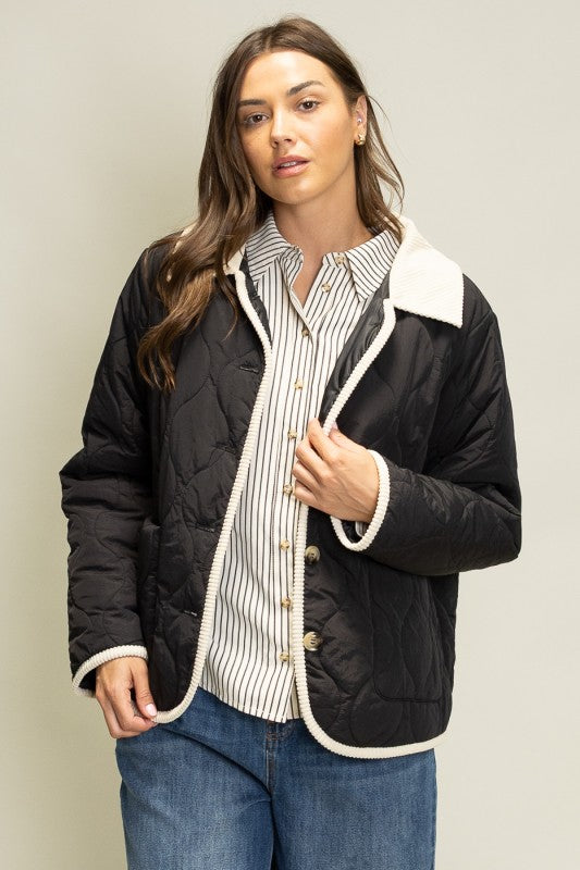 This quilted jacket brings cozy comfort and classic charm together with its soft padding and wave-stitched texture. The contrast corduroy trim along the collar, cuffs, and hem adds a stylish touch, while the button-down front and front pockets provide both function and flair. A boutique-worthy outerwear piece perfect for layering through cooler seasons.