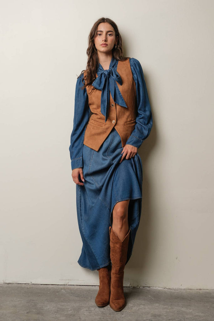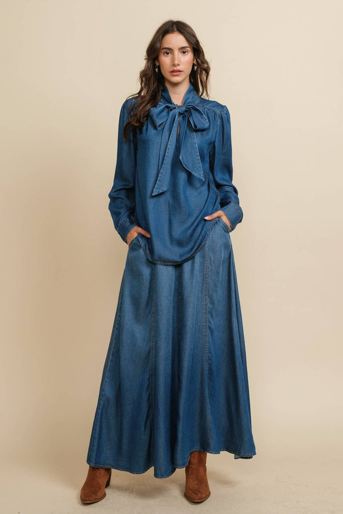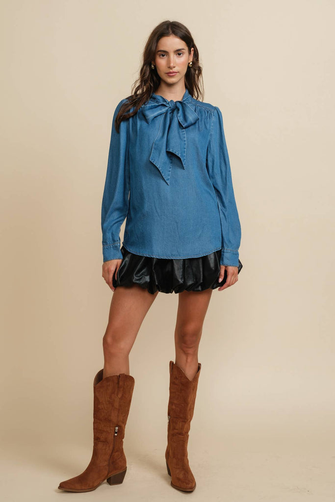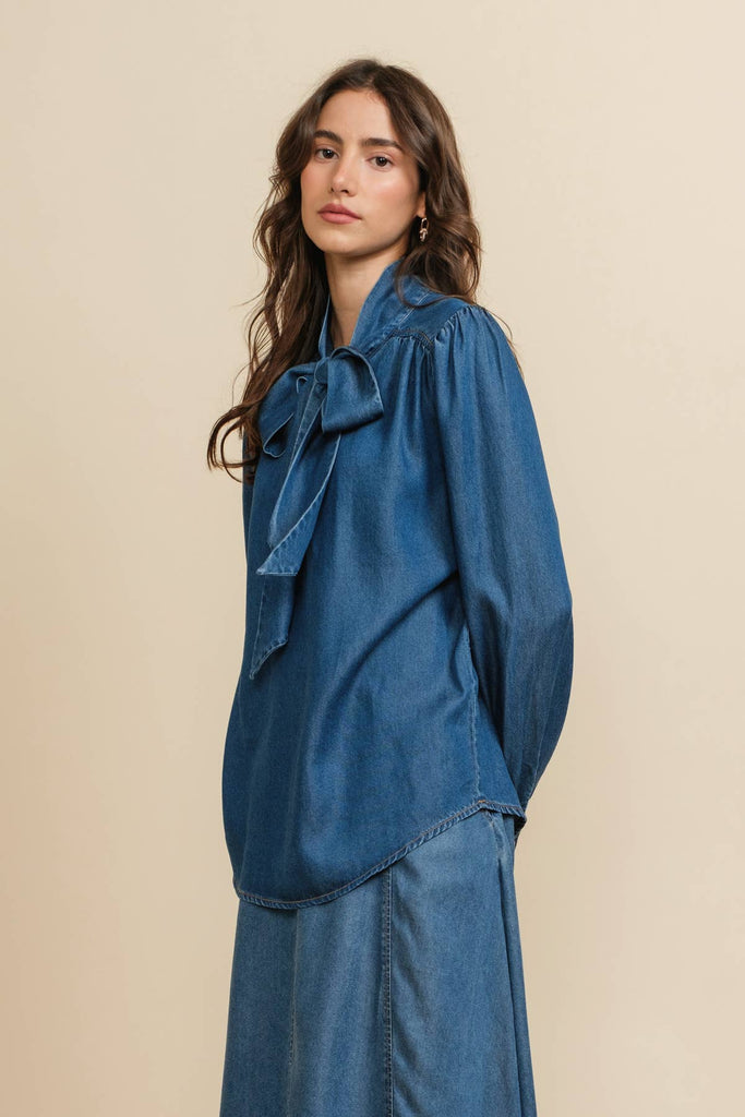 A feminine take on classic denim. This tie-neck blouse features a soft lyocell fabric with a fluid drape, puffed shoulders, and gathered details for a soft, romantic silhouette. Perfectly lightweight for year-round wear, this versatile piece works beautifully tucked or untucked.