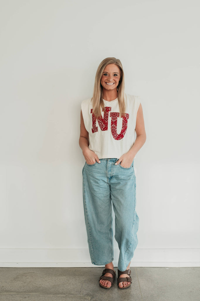 NU Applique Tank – Ivory Rolled Muscle Tank This premium tank features hand-sewn appliqué lettering in a cute red bandana fabric! Unisex fit – runs true to size for a relaxed, comfortable feel. High-quality appliqué – each letter is carefully sewn on for a lasting finish.