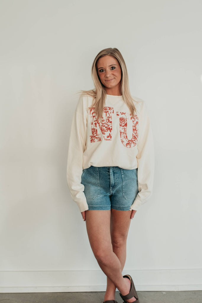 NU Applique Crew – Ivory Comfort Wash Crew Show off your Nebraska pride in style with our adorable NU Appliqué Crew! This premium Comfort Wash Crew features hand-sewn appliqué lettering in a cute red floral fabric! Unisex fit – runs true to size for a relaxed, comfortable feel. High-quality appliqué – each letter is carefully sewn on for a lasting finish.