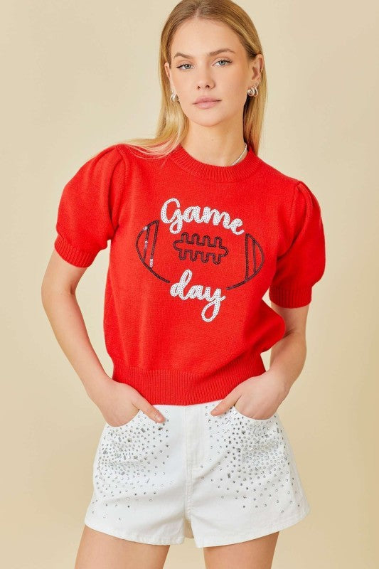 Sequin Embroidered Game Day Puff Sleeve Sweater Top100% Acrylic