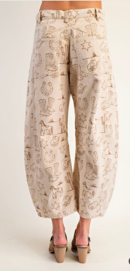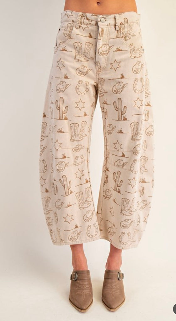MINERAL WASHED WESTERN BARREL LEG JEANS - WESTERN PRINT