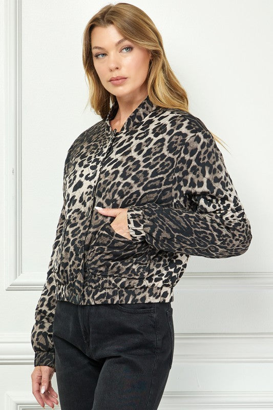 This leopard print bomber jacket brings bold, modern edge to everyday layering. Designed with a cropped silhouette, it features buttin-front closure, pockets, and elasticized hem and cuffs for a structured yet relaxed fit. The all-over leopard pattern in earthy neutrals adds a statement-making appeal while remaining versatile for pairing with jeans, skirts, or dresses. Crafted for both comfort and style, this jacket is perfect for elevating casual looks with a confident, fashion-forward touch. (full lined)
